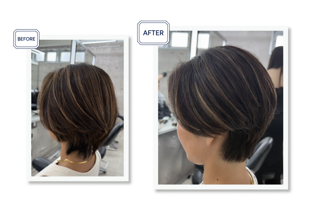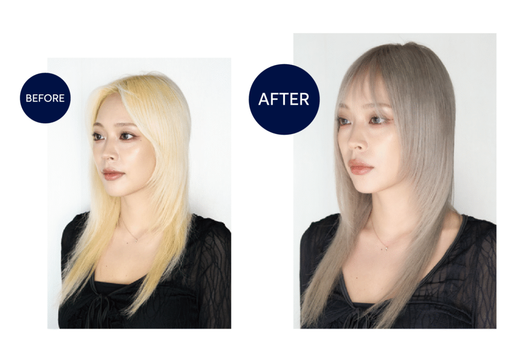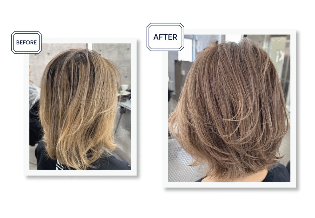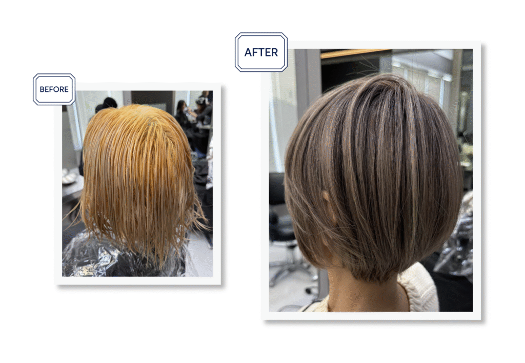 ブリーチ毛の黄みやぎらつきを抑え、品のある肌なじみのよいナチュラルグレージュに仕上がります。