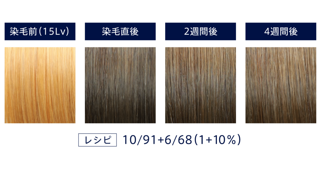 - 施術後から褪色過程を通じてブリーチ特有のぎらつきを防止